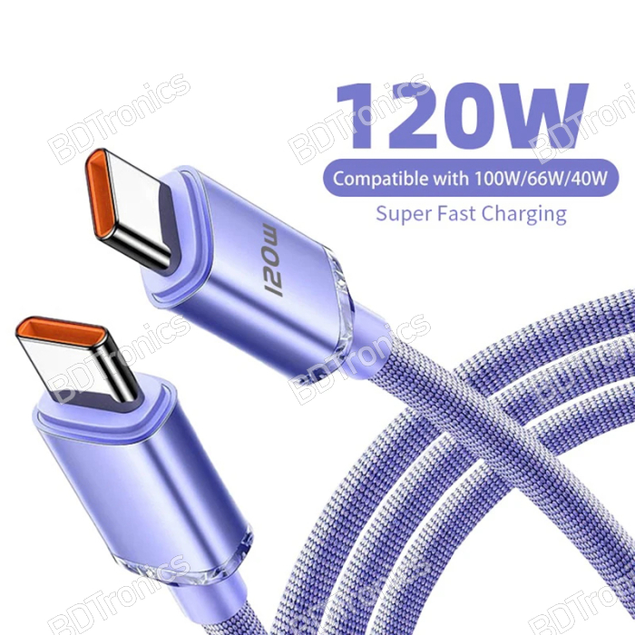 120W USB Type C to Type C Fast Charging Cable is designed for ultra-fast charging and stable data transfer for smartphones, tablets, laptops, and USB-C devices in Bangladesh. This high-power USB C cable supports Power Delivery fast charging, ensuring efficient charging performance for Samsung, Xiaomi, Huawei, Realme, and other USB Type C devices. Durable construction and high-speed transmission make it ideal for daily charging, office use, and travel. Available from BDTronics Bangladesh for reliable fast charging solutions.