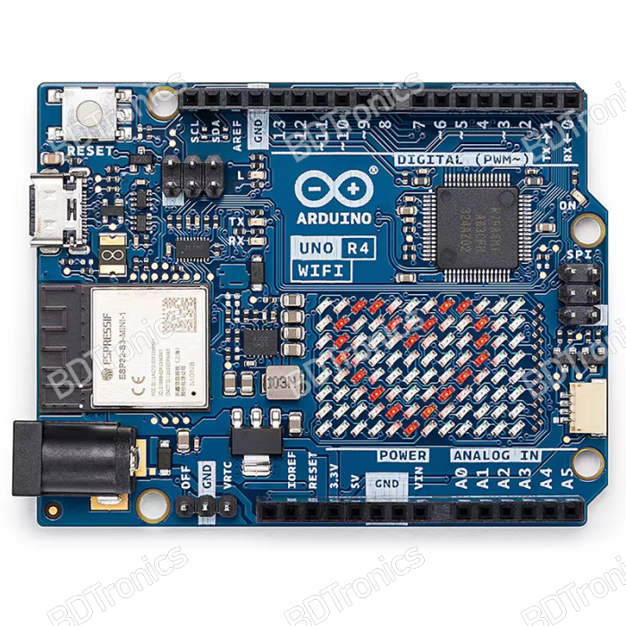 The onboard ESP32-S3-MINI-1-N8 module provides integrated Wi-Fi and Bluetooth connectivity, enabling wireless communication, cloud connectivity, and IoT development without external modules. Communication between the RA4M1 and ESP32-S3 is handled through a logic-level translator for stable 5V-to-3.3V operation. With expanded memory, USB-C power, Qwiic connector support, and rich communication interfaces, the Arduino UNO R4 WiFi is ideal for education, prototyping, and production-ready applications. BDTronics supplies the original Made in Italy version for guaranteed authenticity and performance.