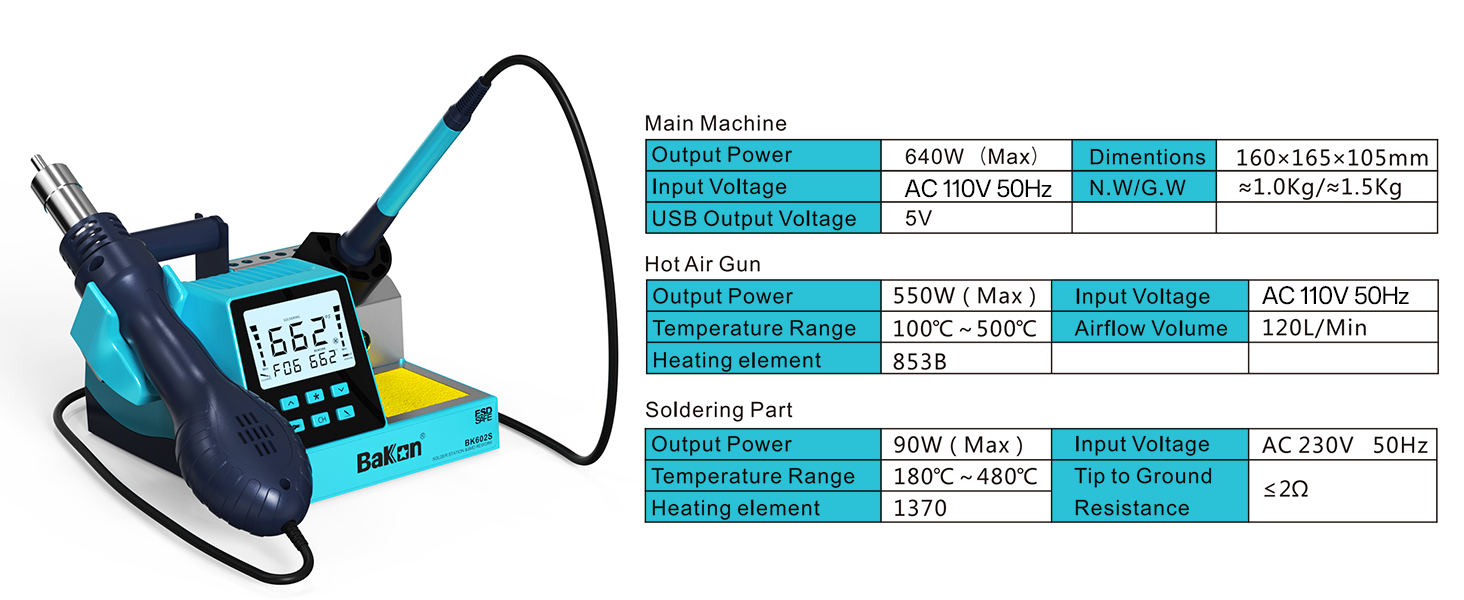 BK602S 2-in-1 Soldering Station with Hot Air Rework Gun is a professional-grade, space-saving solution for electronics repair, DIY projects, and circuit board soldering. Designed with advanced temperature control, rapid heat-up technology, and multiple safety features, this soldering station kit is perfect for precise soldering and desoldering work on a wide range of electronic components.