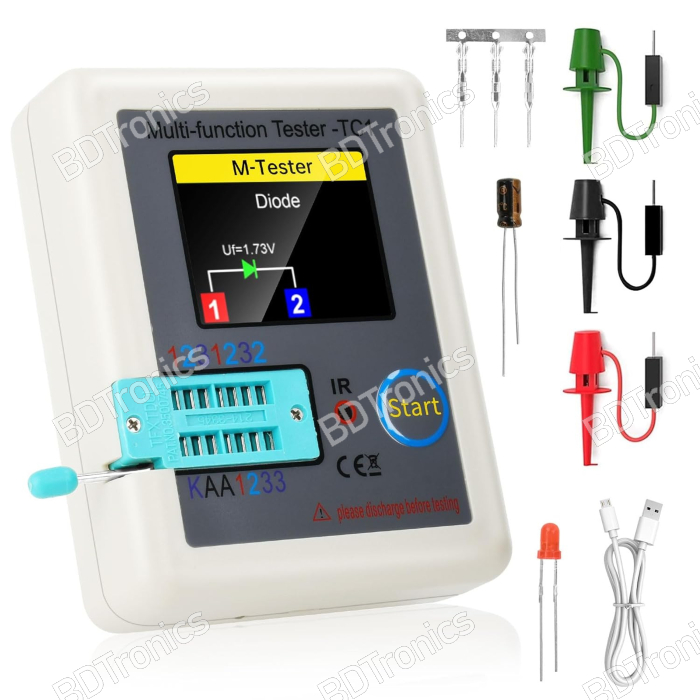 The LCR-TC1 1.8" Component Tester is a multi-functional digital tester designed to accurately identify, measure, and analyze a wide range of electronic components including transistors, diodes, MOSFETs, capacitors, resistors, inductors, thyristors, IGBTs, JFETs, and even Infrared (IR) remote signals. It combines multiple measuring functions into a single compact device, making it an essential tool for electronics hobbyists, students, and professionals in electronics repair, design, and testing.