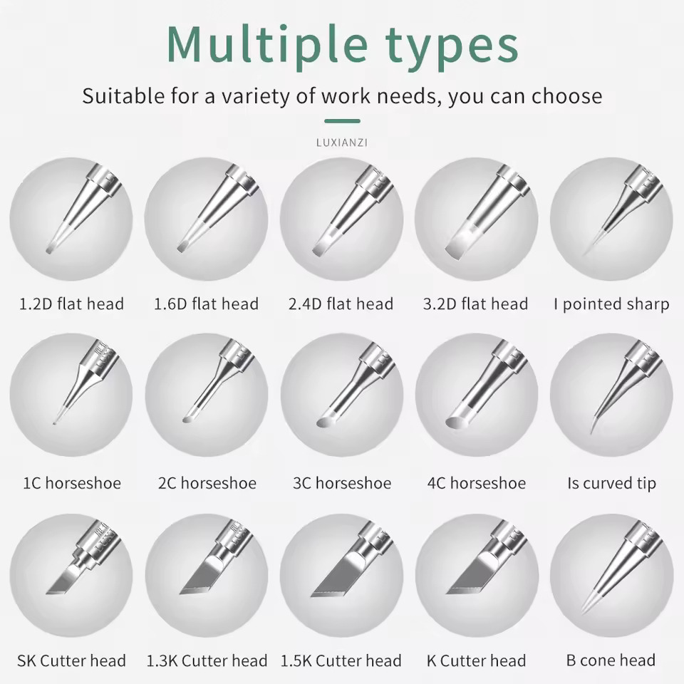 | K / 1.3K / 1.5K | Knife-type multipurpose tip for drag soldering, SOJ, PLCC, SOP, and QFP packages. Ideal for tin bridge correction. |