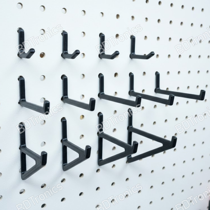 The hooks feature chamfered edges to maximize cross-section strength, ensuring a snug fit without additional support. They are easy to install, remove, and adjust, making them perfect for customizing pegboard layouts quickly. The set includes short hooks, long hooks, and support hooks in multiple lengths to accommodate various items. BDTronics supplies these pegboard hooks in Bangladesh for makers, DIY enthusiasts, and home organizers.