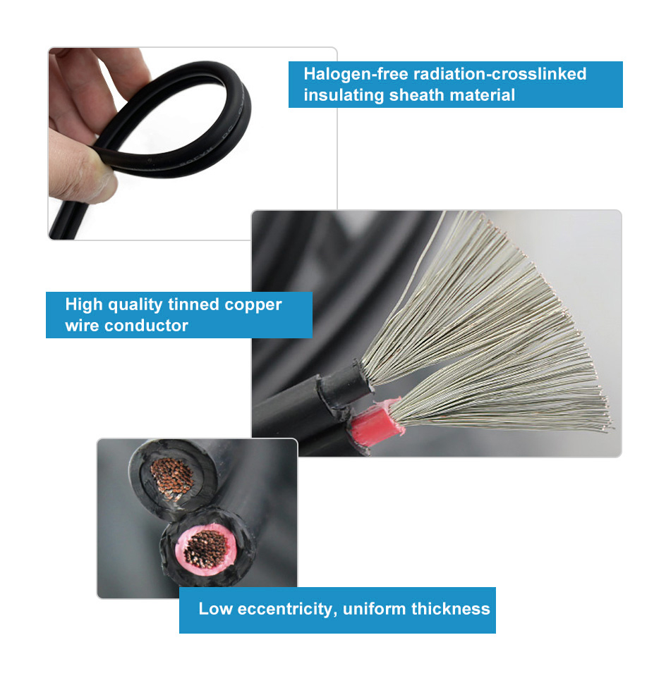High Quality TUV 2PfG 1169 Tinned Pure Copper PV Cable 1000V have Double insulation, electron-beam cross-linked cables for photovoltaic power station. UV shield and tinned pure copper threads ensure corrission free operation and long service life.