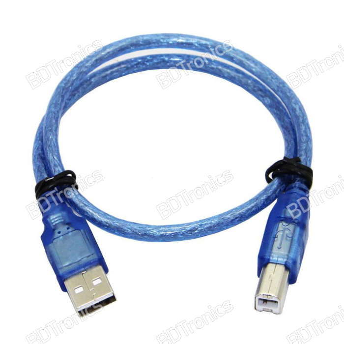 This USB Type-B cable is commonly used with Arduino Uno, Arduino Mega 2560, Arduino Due, CNC controller boards, 3D printer controller boards, and various industrial and laboratory devices. Available from BDTronics, a trusted electronics and robotics components seller in Bangladesh.